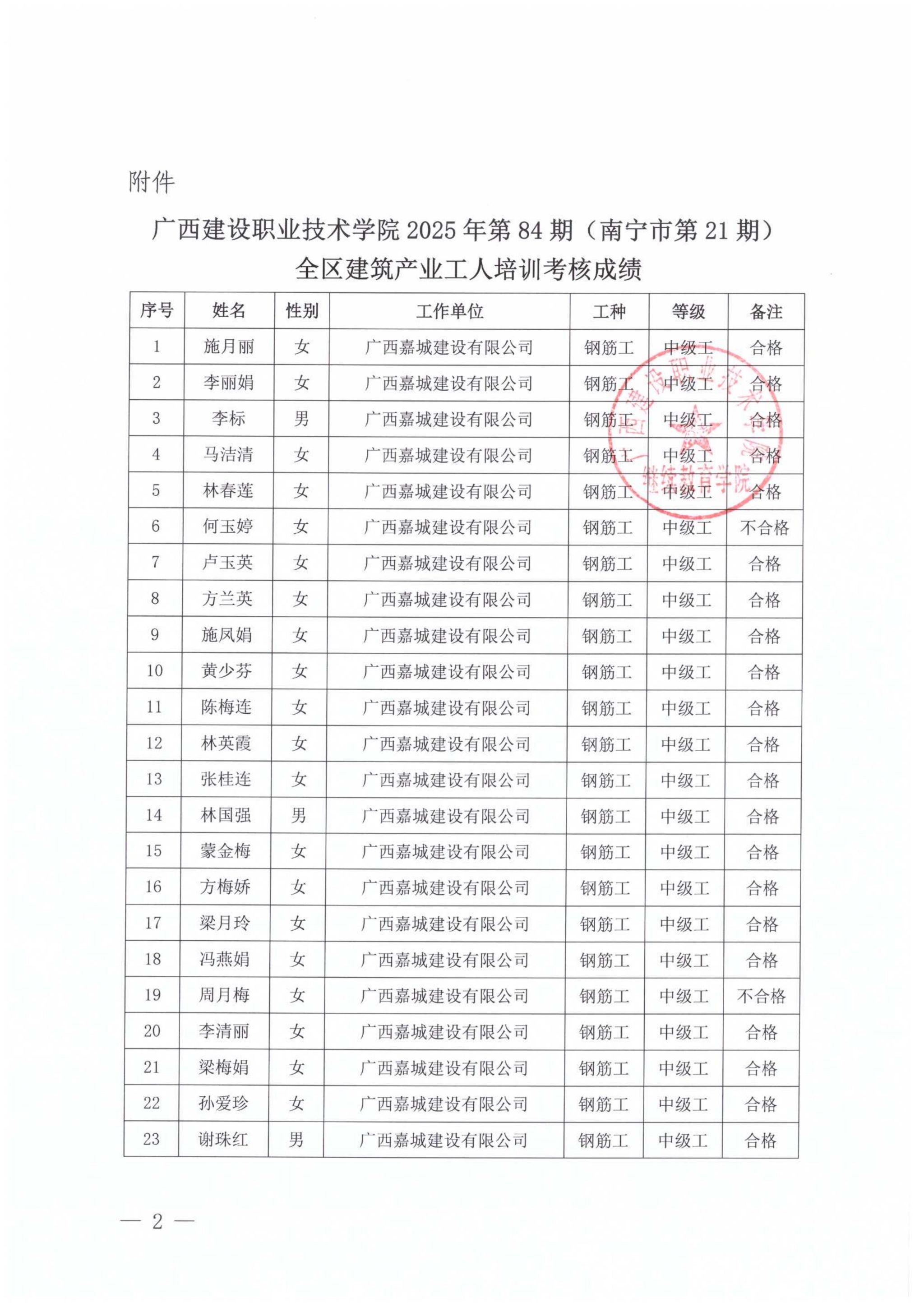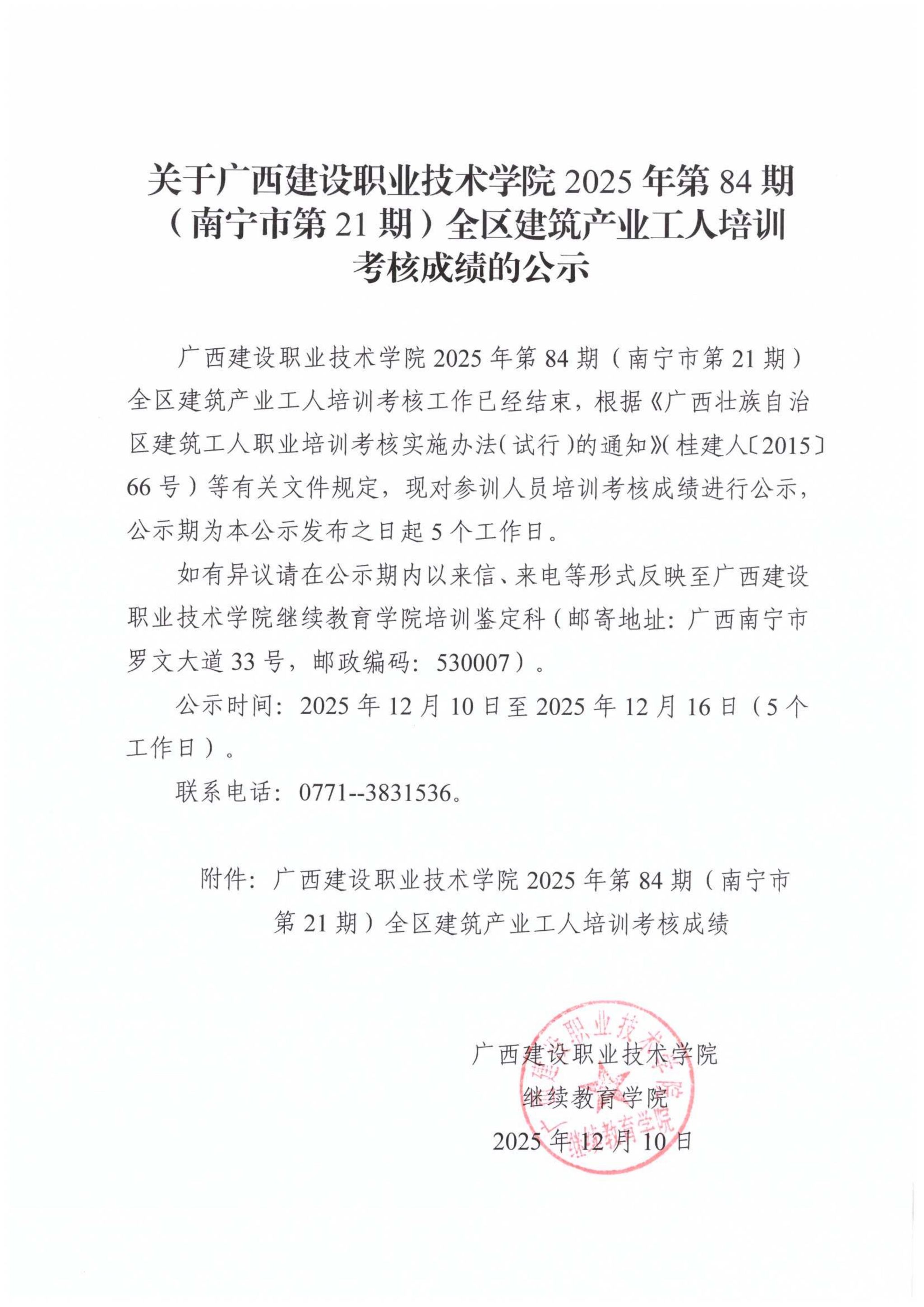 关于完美网页版2025年第84期(南宁市第21期)全区建筑产业工人培训考核成绩的公示