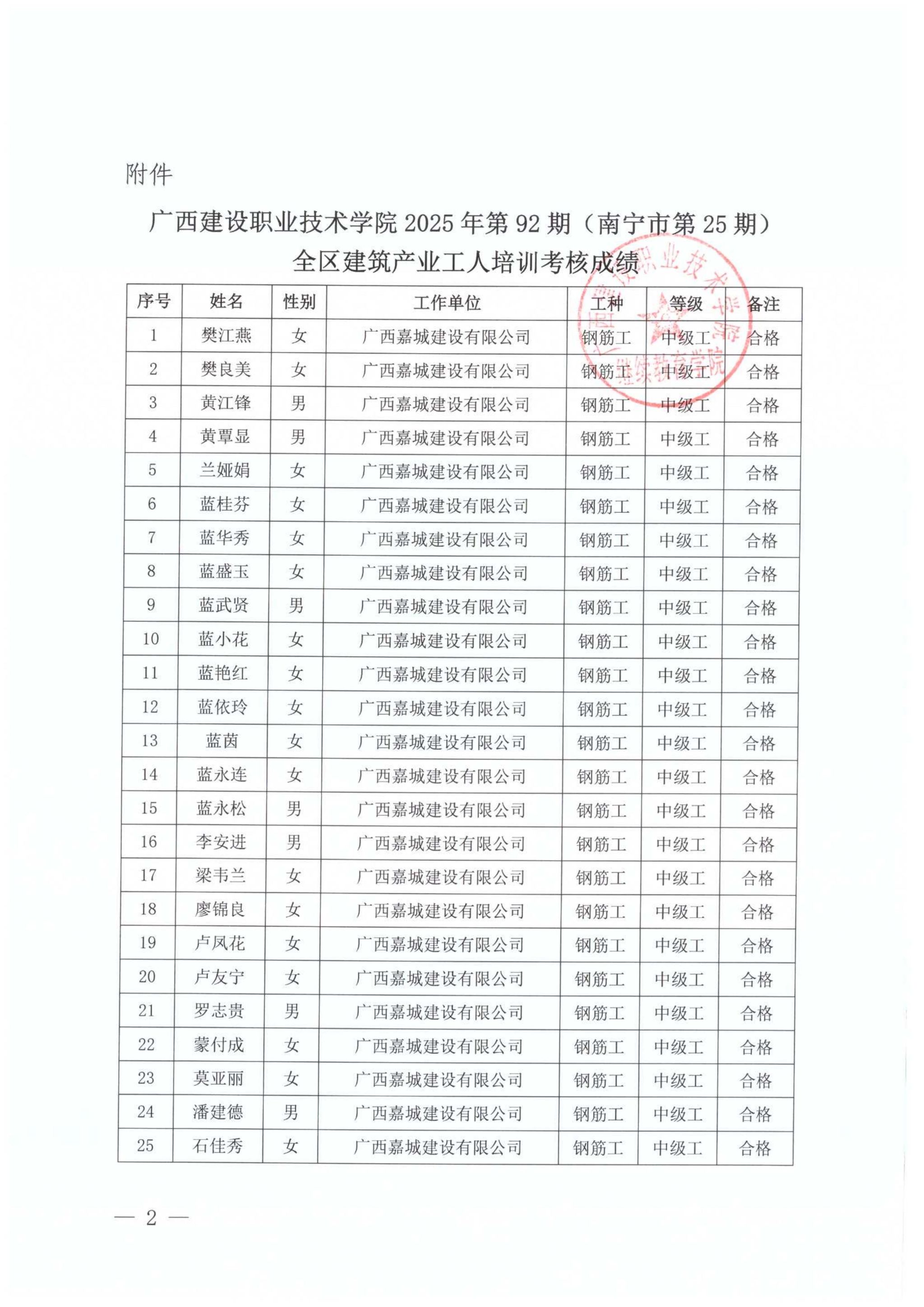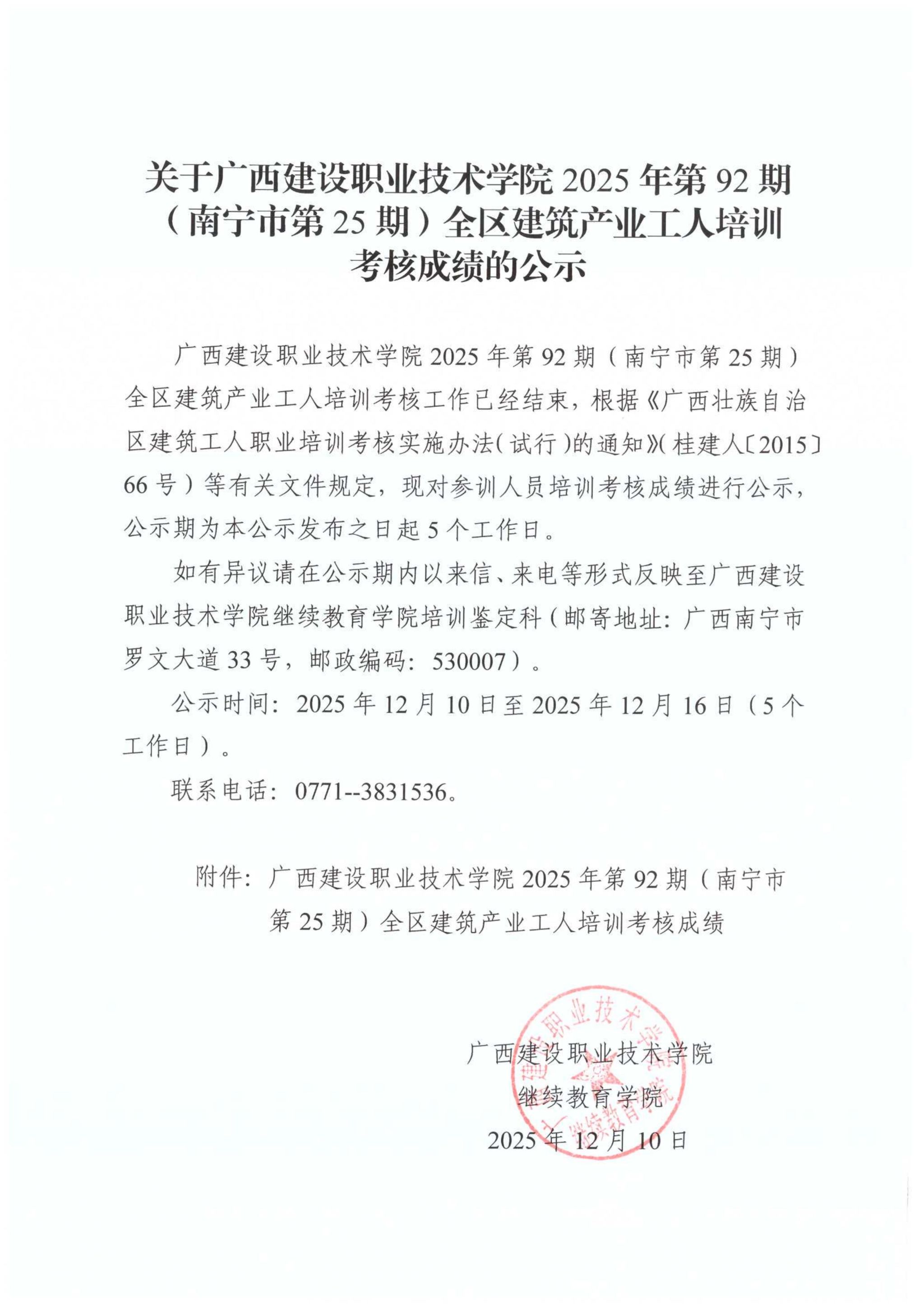 关于完美网页版2025年第92期(南宁市第25期)全区建筑产业工人培训考核成绩的公示