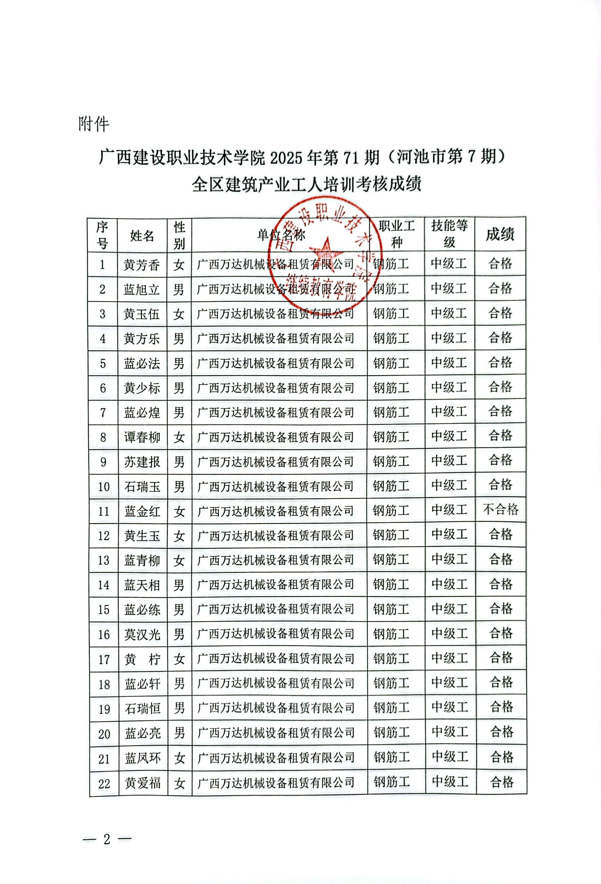 成绩公示 当前位置: 首页 >> 成绩公示 >> 正文 关于完美网页版2025年全区建筑产业工人第71期(河池市第7期)培训考核成绩的公示 发布日期:2025-12-18 点击: 附件【关于完美网页版2025年全区建筑产业工人第71期(河池市第7期)培训考核成绩的公示.docx.pdf】已下载次