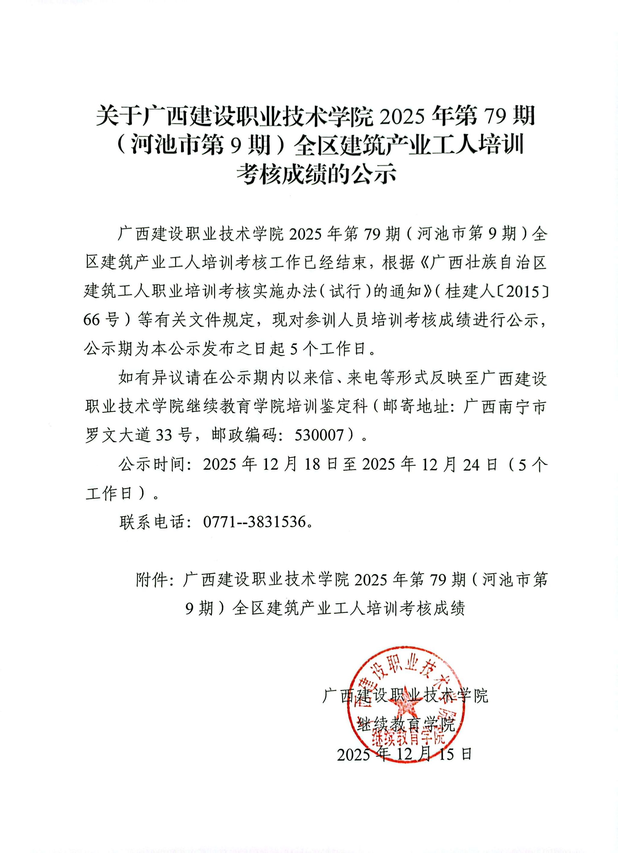 成绩公示 当前位置: 首页 >> 成绩公示 >> 正文 关于完美网页版2025年全区建筑产业工人第79期(河池市第9期)培训考核成绩的公示 发布日期:2025-12-18 点击: 附件【关于完美网页版2025年全区建筑产业工人第79期(河池市第9期)培训考核成绩的公示.pdf】已下载次
