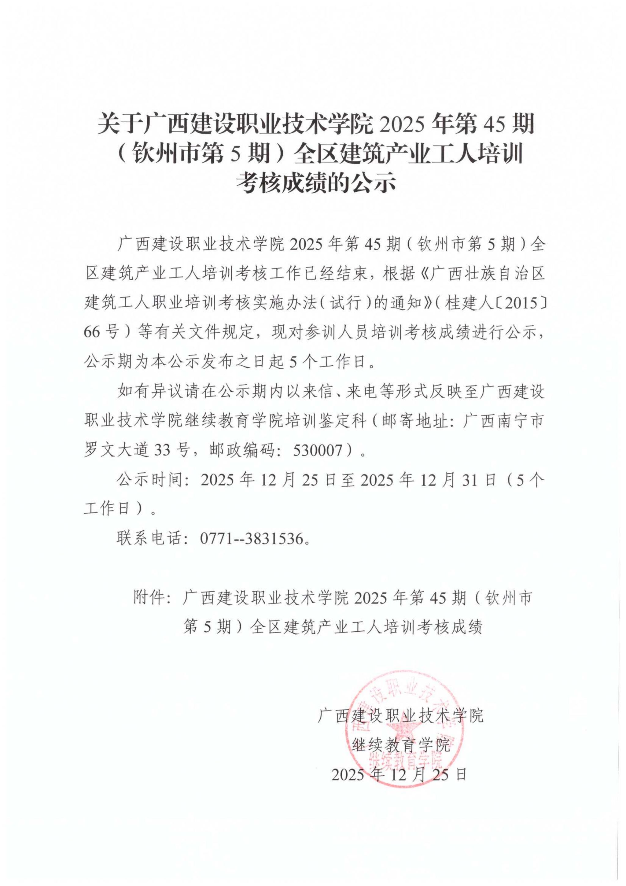 成绩公示 当前位置: 首页 >> 成绩公示 >> 正文 关于完美网页版2025年第45期(钦州市第5期)全区建筑产业工人培训考核成绩的公示 发布日期:2025-12-25 点击: 附件【关于完美网页版2025年第45期(钦州市第5期)全区建筑产业工人培训考核成绩的公示.pdf】已下载次