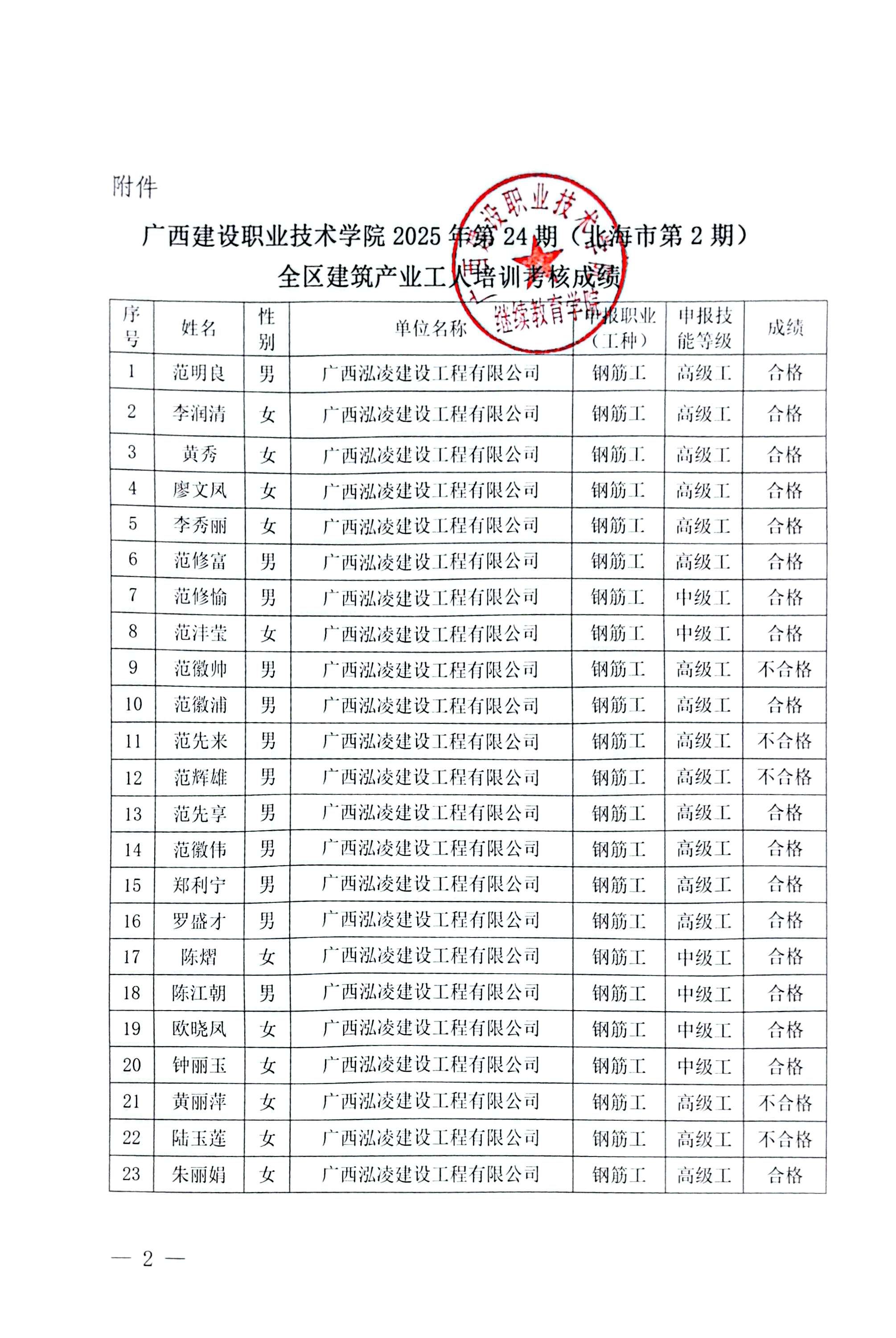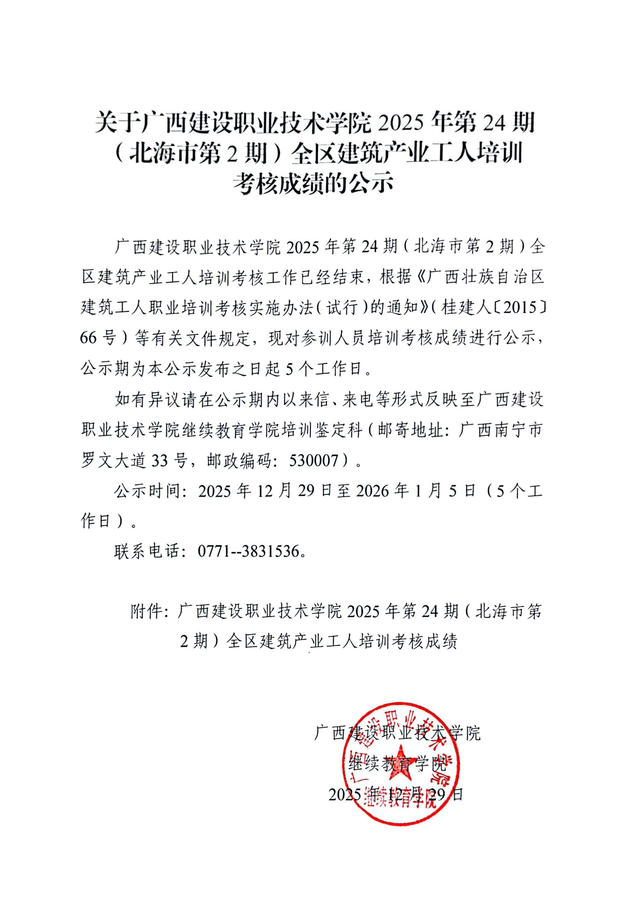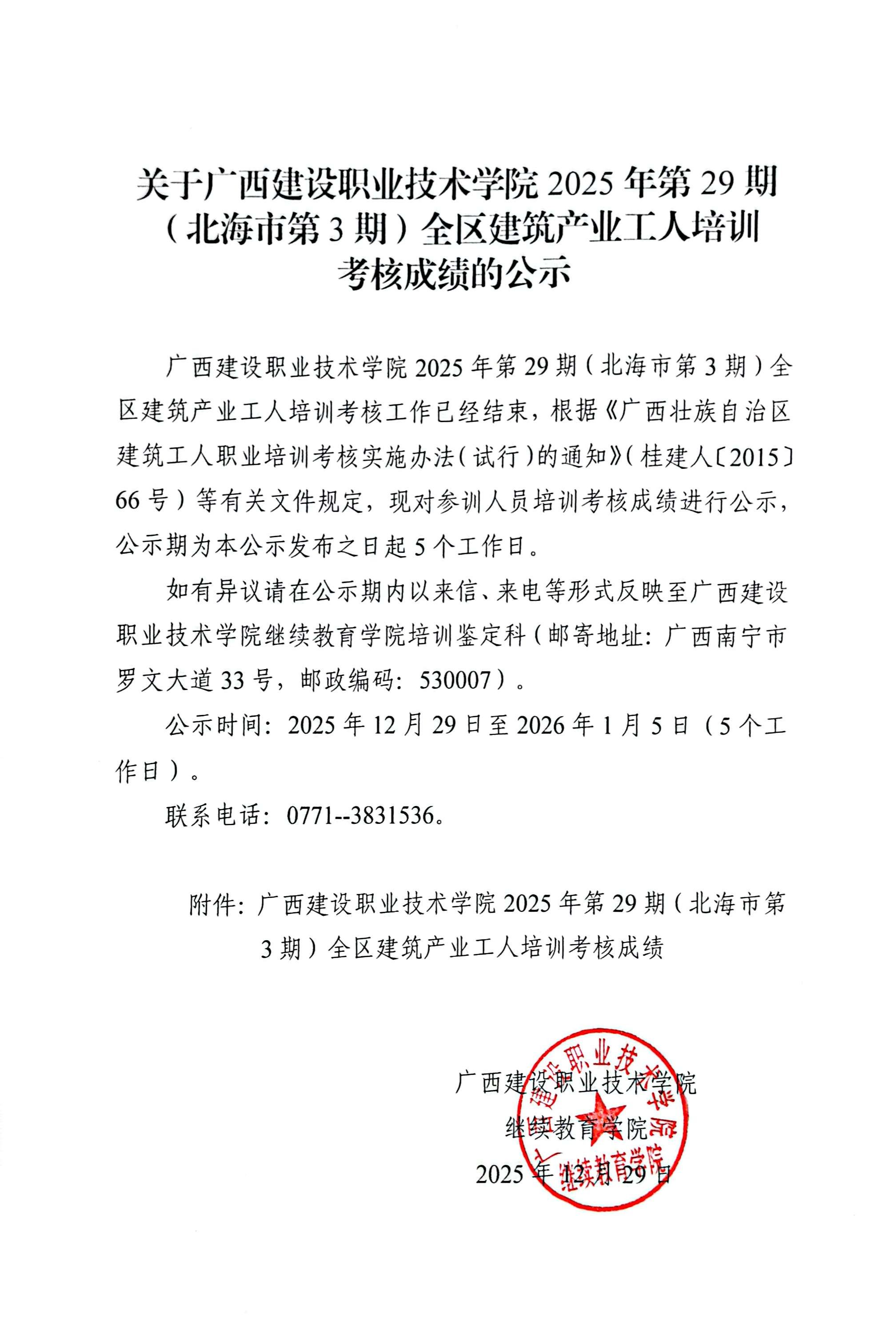 成绩公示 当前位置: 首页 >> 成绩公示 >> 正文 关于完美网页版2025年全区建筑产业工人第29期(北海市第3期)培训考核成绩的公示 发布日期:2025-12-29 点击: 附件【关于完美网页版2025年全区建筑产业工人第24期(北海市第2期)培训考核成绩的公示.pdf】已下载次 附件【关于完美网页版2025年全区建筑产业工人第29期(北海市第3期)培训考核成绩的公示.pdf】已下载次