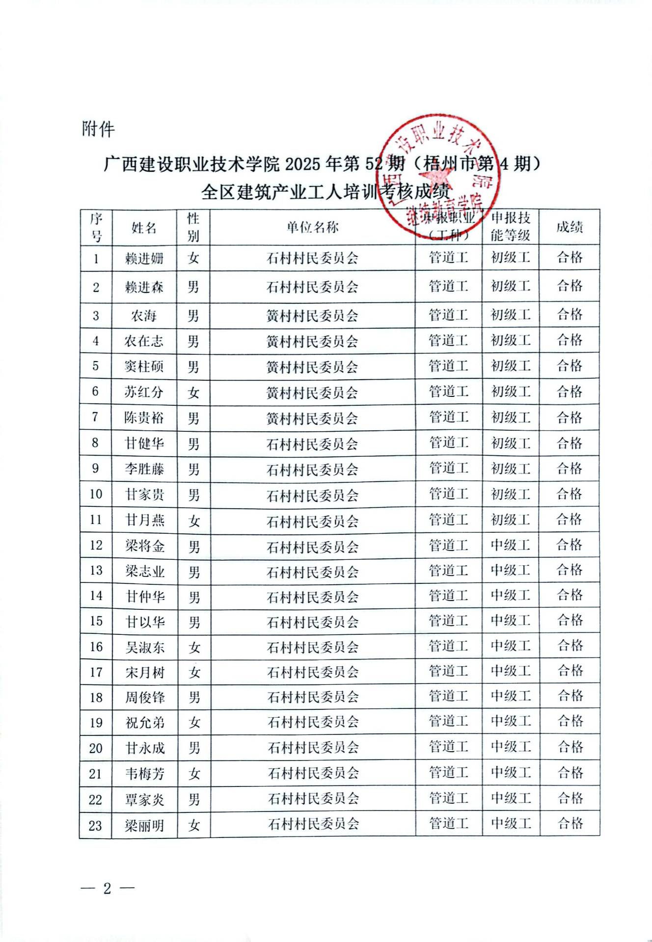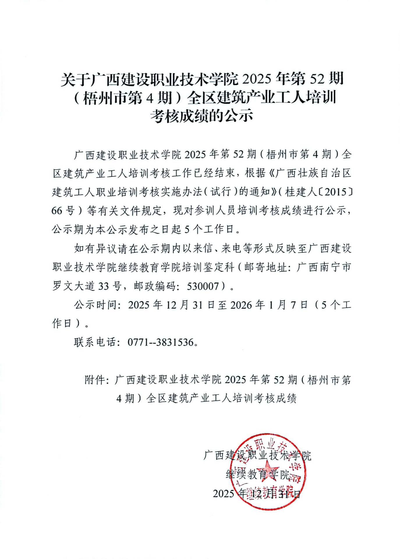 成绩公示 当前位置: 首页 >> 成绩公示 >> 正文 关于完美网页版2025年第52期(梧州市第4期)全区建筑产业工人培训考核成绩的公示 发布日期:2025-12-31 点击: 附件【关于完美网页版2025年第52期(梧州市第4期)全区建筑产业工人培训考核成绩的公示.pdf】已下载次