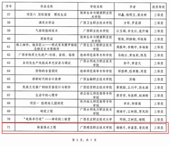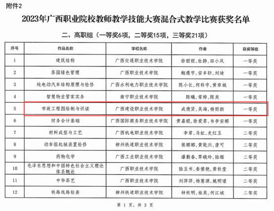 市政与交通学院1222日讯(图/  何秉润在刚结束的2023年广西职业院校教师教学技能大赛混合式教学和微课教学比赛中,我院由成德贤、吴海、杨雨韵老师组成的混合式教学团队,携参赛作品《市政工程图绘制与识读》荣获全区一等奖,由谢晓冬、李嘉薏、曾庆建老师组成的微课教学团队携参赛作品《路基排水工程》荣获全区三等奖,这也是2023年继课堂教学赛项后我院在广西职业院校教师教学技能大赛中获得的又一项一等奖。