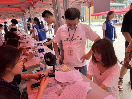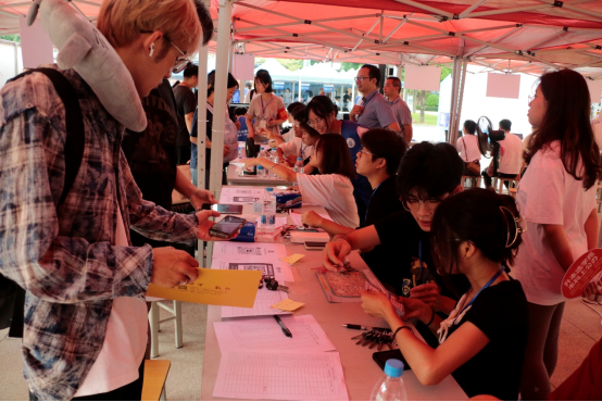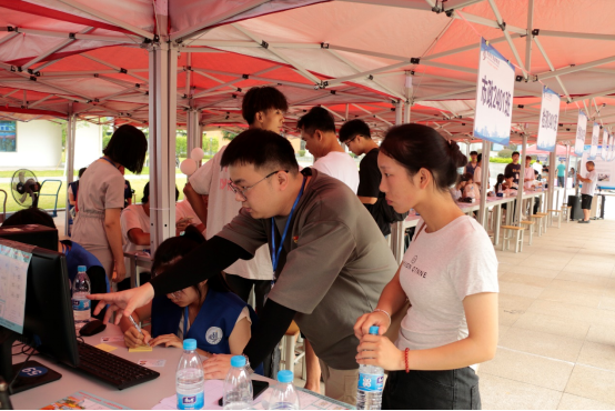 尽管天气十分闷热,也阻挡不了每一位志愿者的热情,学院在校门口设立了迎新指引点,当新生和家长一入校志愿者们便立刻微笑着迎上去,并热情帮助新生搬运行李,带领他们前往自己的学院大本营,校园内到处都是他们热情忙碌的身影。