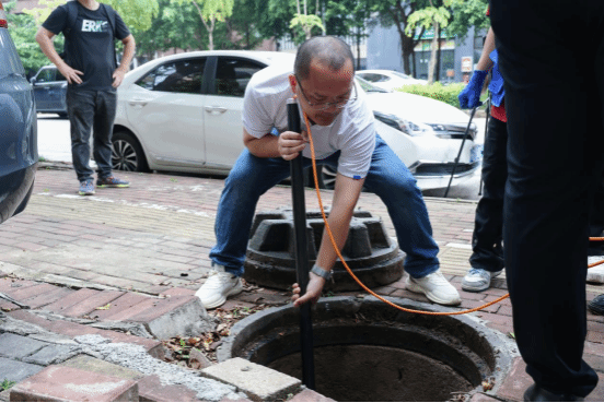 志愿者运用管道内窥潜望镜对小区排水管道进行检测