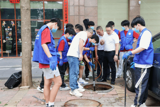 志愿服务队被分为下水管道检测组和社区清洁组两大板块,同步在社区内推进志愿服务工作。其中,下水管道安全检测组的志愿者们一到社区便迅速行动。在社区工作人员的指导下,志愿者们手持手电筒、检测镜、测量尺等专业工具,运用管道内窥潜望镜专业检测仪器对小区的下水管道进行了细致排查。指导老师凭借丰富的专业经验,全过程指导志愿者进行检测操作及研究,一堂“行走”的专业实践课程就此展开。志愿者们一边检测,一边详细记录发现的问题,包括堵塞、渗漏等潜在安全隐患的位置、类型和严重程度,并拍摄了照片以备后续处理。通过志愿者们的专业努力和细致工作,小区的下水管道得到了有效排查和维护,为居民的安全居住提供了有力保障。