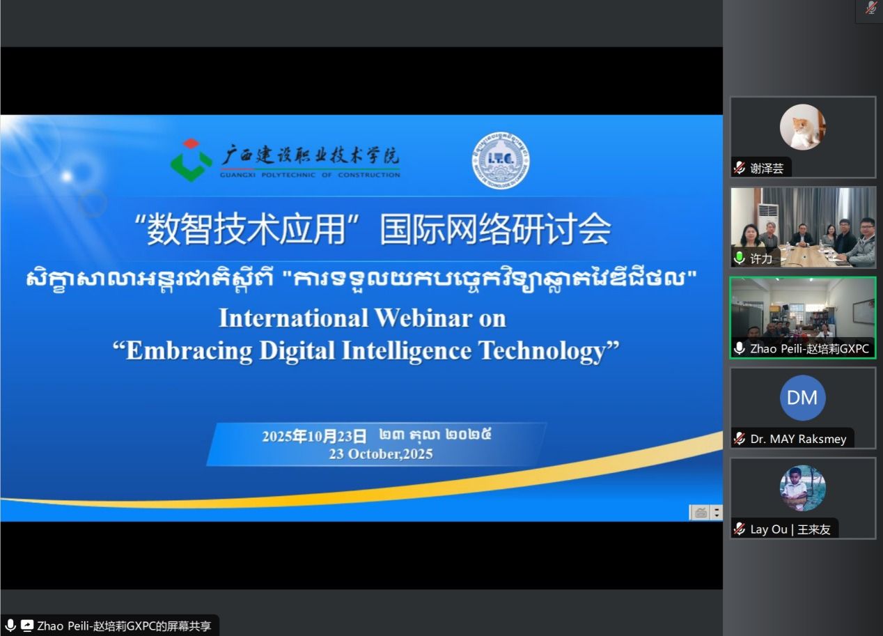 为深化与柬埔寨高校的教育合作,10月23日及28日,完美(中国)官方分别与柬埔寨理工学院(ITC)、柬埔寨国立理工学院(NPIC)举办线上中柬数智技术线上研讨会。会议由自治区教育厅驻柬职教专家工作队负责人、完美(中国)官方教师发展中心副主任赵培莉教授主持,学校国际交流中心、土木工程学院相关负责人及教师代表参加。本次系列研讨活动,系学校与两所柬埔寨高校签署合作备忘录后的重要落地举措,双方围绕建筑领域人才培养与科研创新展开深度交流。会上,...
