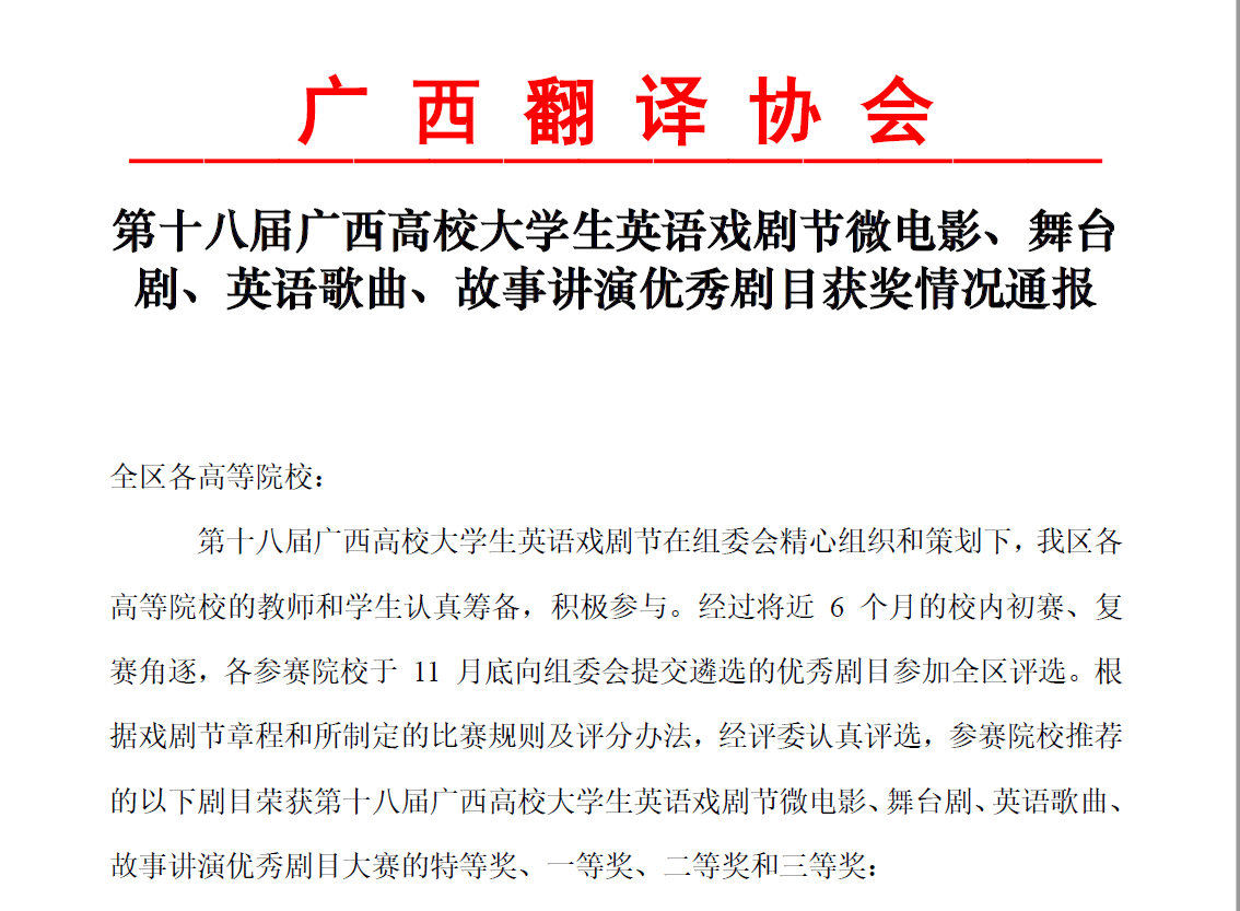 广西建院12月16日讯(人文教育学院 卢森源)近日,由广西高校外语教育研究专业委员会协同广西翻译协会主办的第十八届广西高校大学生英语戏剧节圆满落幕。在完美(中国)官方英语教研团队的带领和人文教育学院卢森源老师的精心指导下,建筑与规划学院学子黄川越喜获故事讲演剧目特等奖,陈志杰、毛嘉慧斩获故事讲演剧目一等奖,江雨霏荣获歌曲演唱比赛一等奖。此番成绩刷新了历年来完美(中国)官方参与该项赛事的最佳记录。 第十八届英语戏剧节获奖文件故事讲演剧目特等奖截图故事讲演剧目一等奖截图歌曲演唱剧目获一等奖截图特等奖剧目《...