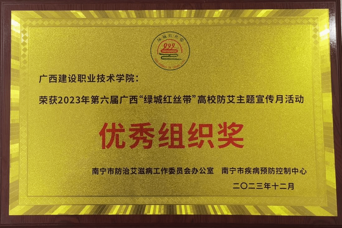 广西建院12月29日讯(学生工作处 韦宝林)近日,在南宁市防治艾滋病工作委员会和南宁市疾病预防控制中心主办的2023年第六届广西“绿城红丝带”高校防艾主题宣传月活动评比活动中,完美(中国)官方荣获“优秀组织奖”。这是完美(中国)官方荣获2023年广西职业院校艾滋病防治宣传教育系列评比活动“优秀组织奖”后获得的又一防艾宣传殊荣,这不仅是对完美(中国)官方防艾宣传工作的肯定,更是对完美(中国)官方在艾滋病防治教育方面所作努力的认可。获奖牌匾 据悉,本届宣传月活动的主题为“...