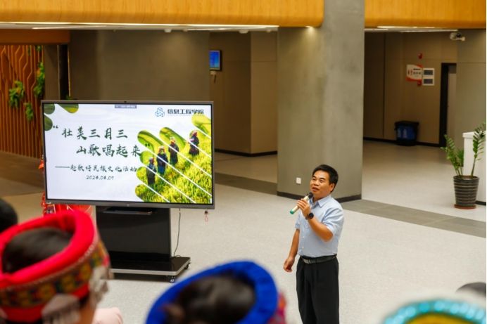 广西建院4月9日讯(信息工程学院文/罗凤媚 罗雪连图/甘海龙)为弘扬民族传统文化,展现民族文化魅力,4月9日下午,信息工程学院在学校图书馆大厅组织开展了“壮美三月三 山歌唱起来”赶歌圩民族文化活动。学校纪委书记唐东升,信息工程学院领导老师、国际留学生及学生代表参加了本次活动。唐东升书记在致辞中指出,“广西三月三”不仅是传统佳节,也是民族文化的重要载体,希望大家在享受文化盛宴的同时,积极传承和弘扬我们的民族文化。...
