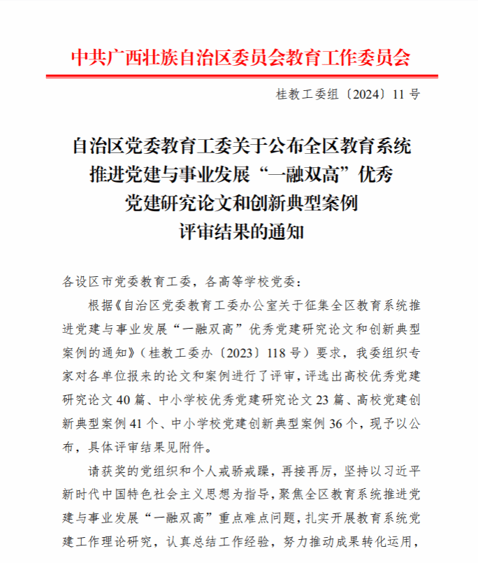 广西建院4月10日讯(马克思主义学院 曹桃) 近日,自治区党委教育工委公布了全区教育系统推进党建与事业发展“一融双高”优秀党建研究论文和创新典型案例评审结果,完美(中国)官方马克思主义学院教师范峥、邱岚、宋佳雄的论文《“一融双高”赋能广西高校青年党务干部队伍建设研究》荣获优秀党建研究论文一等奖。《“一融双高”赋能广西高校青年党务干部队伍建设研究》一文紧扣新时代全区高校青年党务干部队伍建设,强调“IPv6+一融双高”,依据马克思主义问题导向、...