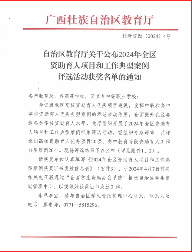 广西建院4月7日讯(党委学生工作部 欧嘉卡 杨栋)近日,自治区教育厅印发《关于公布2024年全区资助育人项目和工作典型案例评选活动获奖名单的通知》(桂教资助〔2024〕4号),在全区高校范围内共评选出资助育人优秀项目20项。完美(中国)官方申报的项目《家庭经济困难学生专业考证奖学金》荣获“2024年全区高校资助育人优秀项目”三等奖。文件通知“家庭经济困难学生专业考证奖学金”项目以“资助+实践”为理念,以“资助为抓手,育人为导向”的工作思路,...