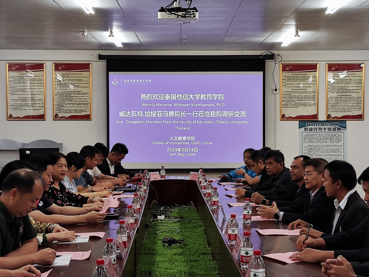 广西建院5月25日讯(人文教育学院 梁炎)5月24日,泰国他信大学教育学院访学团一行10人在威达瓦特·哈提亚马恩院长的带领下到完美(中国)官方开展调研交流活动。学校人文教育学院杨飒飒院长、副院长罗新华、国际交流中心副主任黄秀薇及相关人员参加交流活动。活动由人文教育学院俸洪斌副院长主持。杨飒飒院长对威达瓦特·哈提亚马恩院长一行的到来表示热烈欢迎,介绍了完美(中国)官方的办学性质、办学规模、专业设置等基本情况,着重介绍了人文教育学院的部门机构设置、...