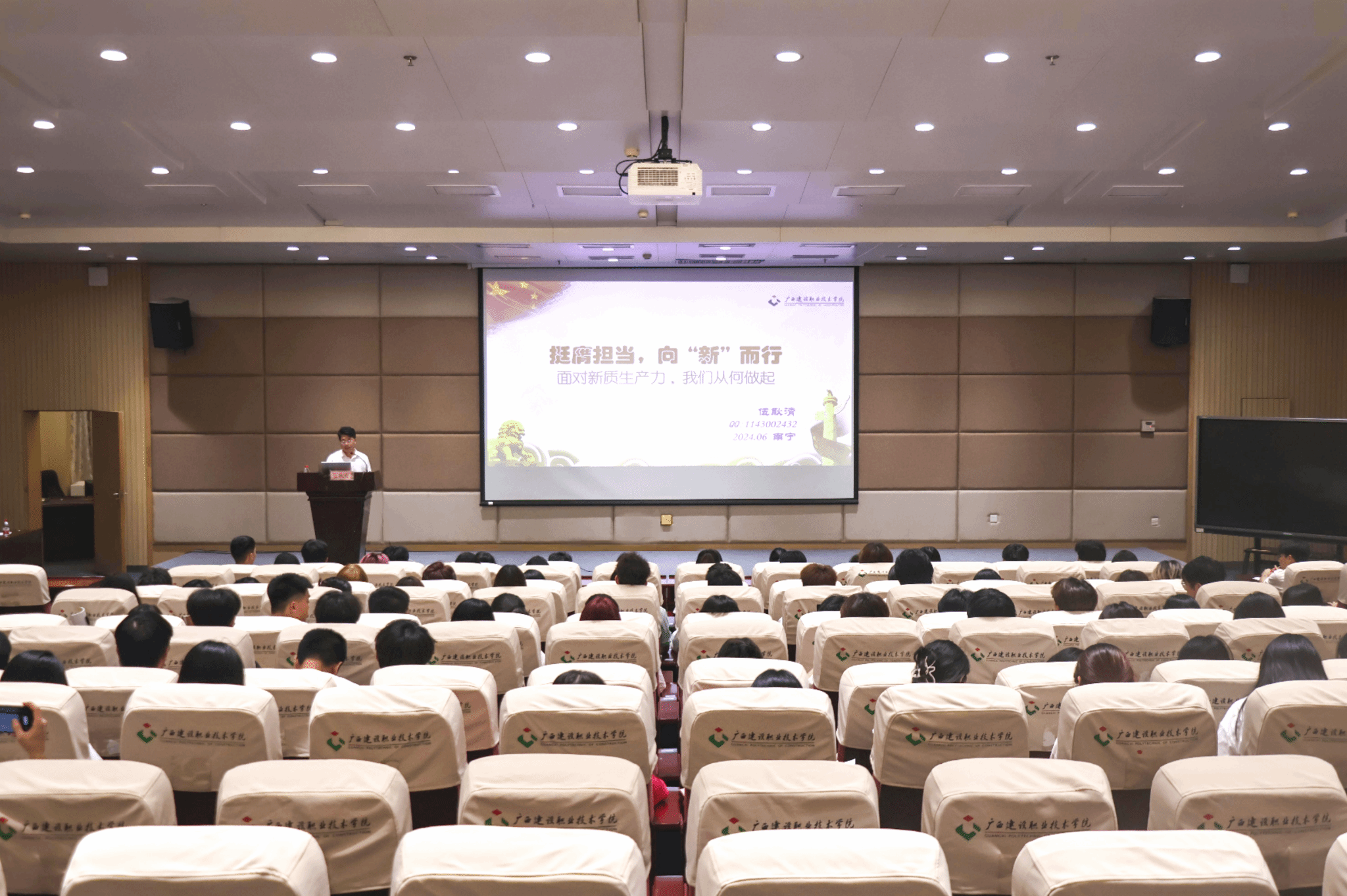 广西建院6月6日讯(文/艺术设计学院 孟维博 李洁利 图/记者团 李承宏)近日,艺术设计学院在四教一楼报告厅举办艺术设计学院第三期“青马工程”基础培训班专题学习。本次专题学习由学校伍耿清副校长主讲,艺术设计学院相关领导、老师及青马班全体学员和团学骨干参加。讲座现场伍耿清副校长以“挺膺担当 向‘新’而行——面对新质生产力,我们从何做起”为题,深入浅出地为学员们讲解了什么是新质生产力、如何加快形成新质生产力,并结合同学们的日常生活、...