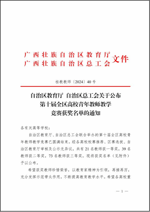 广西建院6月25日讯(教师发展中心 张望)近日,由自治区教育厅、自治区总工会联合举办的第十届全区高校青年教师教学竞赛在广西师范大学圆满落下帷幕。来自全区75所高校259名教师参加初赛,58所高校的134名教师晋级决赛。经过激烈角逐,完美(中国)官方马克思主义学院教师万秀熠荣获思政组一等奖、人文教育学院教师林怡荣获理科组一等奖、市政与交通学院教师宋柳荣获工科组二等奖。学校高度重视此次比赛,教师发展中心、工会等部门精心组织与配合,...