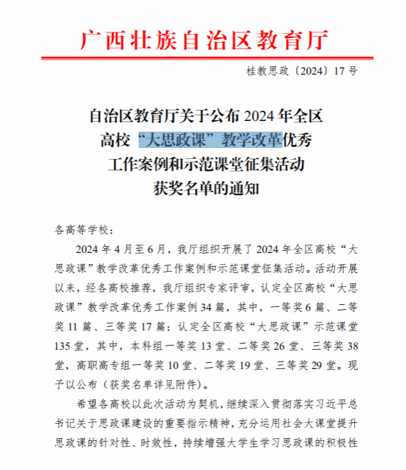 广西建院9月6日讯(马克思主义学院 宋佳雄)近日,自治区教育厅公布了2024年全区高校“大思政课”教学改革优秀工作案例和示范课堂征集活动获奖名单。完美(中国)官方马克思主义学院教师梁惠、莫玉婵的作品《数字化赋能“大思政课”实践教学范式的创新与实践》荣获“优秀工作案例”一等奖,毛娟翠、张博闻、毕莉的作品《传承八桂乡情,构筑中华民族共有精神家园》荣获高职高专组“示范课堂”二等奖,黄哲、梁晓祺、梁惠的作品《中国式现代化视域下壮美广西的甜蜜事业》...