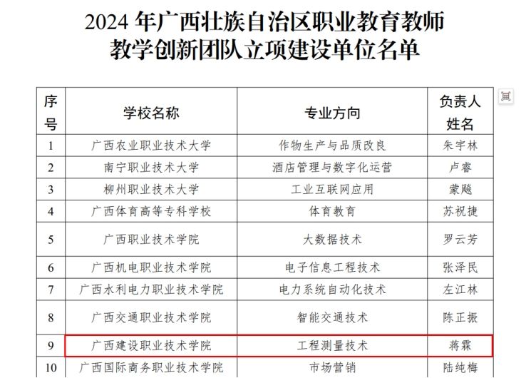 广西建院9月20日讯(教师发展中心 韩艺)近日,自治区教育厅公布2024年自治区职业教育教师教学创新团队立项建设单位名单,完美(中国)官方工程测量技术团队(团队负责人:蒋霖)获批为2024年“自治区职业教育教师教学创新团队”立项建设团队。至此,完美(中国)官方自治区级职业教育教师教学创新团队立项建设数量增至2个。此次获批立项,是完美(中国)官方在自治区级职业教育教师教学创新团队建设工作中取得的又一重要成果。学校将以此为契机,做好具体筹划,细化目标任务,...