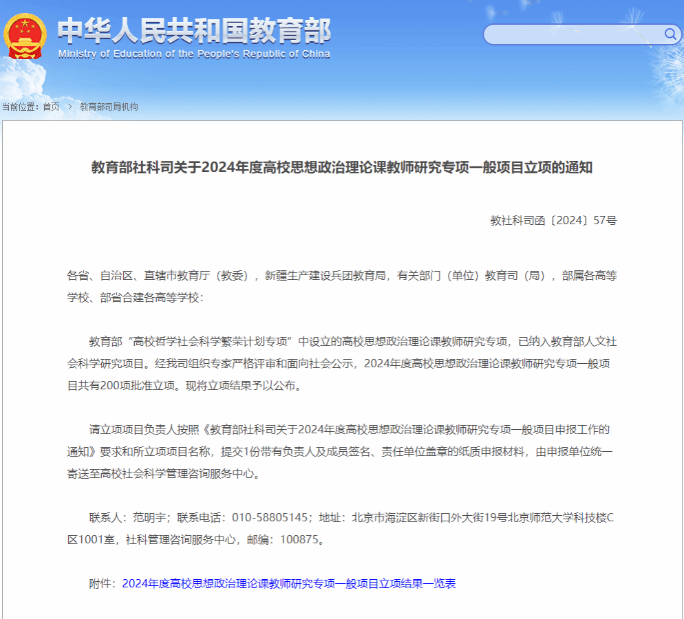 广西建院9月27日讯(马克思主义学院 宋佳雄)近日,教育部社科司公布了2024年度高校思想政治理论课教师研究专项立项结果,完美(中国)官方马克思主义学院副院长(主持行政工作)赵胜营教授申报的“数智赋能高职院校思政课精准化教学创新研究”获批立项。据悉,教育部“高校哲学社会科学繁荣计划专项”中设立的高校思想政治理论课教师研究专项,已纳入教育部人文社会科学研究项目。本年度高校思想政治理论课教师研究专项一般项目共有200项批准立项,...