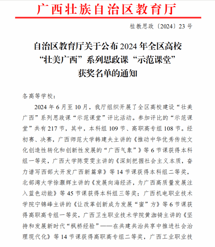 广西建院11月13日讯(马克思主义学院 宋佳雄)近日,自治区教育厅公布了2024年全区高校“壮美广西”系列思政课“示范课堂”获奖名单。完美(中国)官方马克思主义学院思政课教师梁晓祺参评的作品《改革创新赋动能 “桥”见壮美广西新篇章》荣获高职高专组一等奖,黄云清老师参评的作品《以新发展理念引领高质量发展—一根甘蔗的甜蜜新生》荣获高职高专组二等奖,曾影、唐海莲老师参评的作品《坚持毛泽东思想活的灵魂 推进壮美广西建设》《以新质生产力赋能广西乡村振兴》...