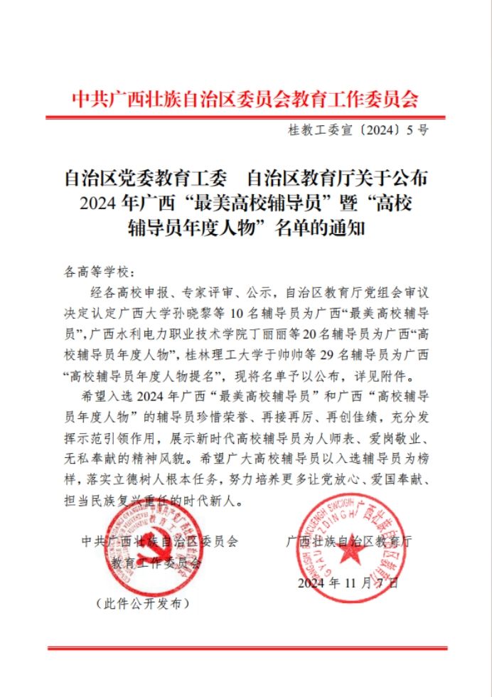 广西建院11月13日讯(图/文 “职”为你工作室)近日,自治区党委教育工委和自治区教育厅共同组织开展的2024年广西“最美高校辅导员”暨“高校辅导员年度人物”推选展示活动评选结果揭晓,完美(中国)官方徐静老师获评2024年广西“最美高校辅导员”。 获奖文件 徐静老师徐静,副教授,扎根辅导员岗位19年,先后陪伴3000多名学生成长成才,现任设备与环境学院团总支书记。第二批广西高校高水平辅导员工作室“职”为你工作室主持人,广西“高校辅导员年度人物”...
