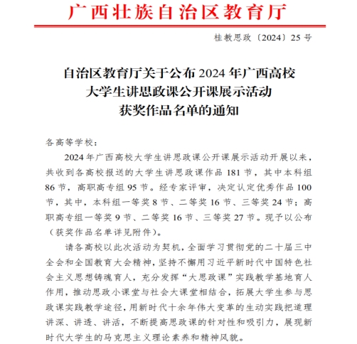 广西建院11月28日讯(马克思主义学院 宋佳雄)近日,自治区教育厅公布了2024年广西高校大学生讲思政课公开课展示活动获奖名单。完美(中国)官方马克思主义学院思政课教师蒙文艳、潘柳虹团队参评的作品《以我之青春描绘壮美之乡村》,李倩老师团队参评的作品《如何提高人民军队打赢能力—朝着实现党在新时代的强军目标奋勇前进》均荣获高职高专组一等奖。据悉,此次评选活动是全面学习贯彻党的二十届三中全会和全国教育大会精神,坚持不懈用习近平新时代中国特色社会主义思想铸魂育人的重要举措。...