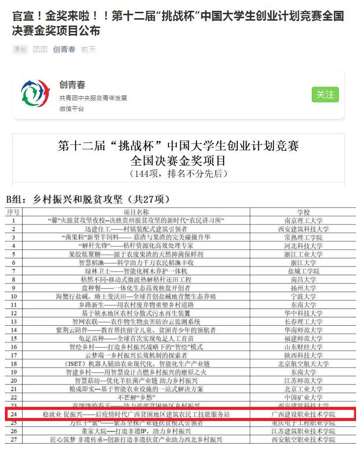 广西建院12月03日讯(建筑设备与环境工程系 龚剑)日前,由共青团中央、教育部、中国科协、全国学联、黑龙江人民政府联合主办的第十二届“挑战杯”中国大学生创业计划竞赛在东北林业大学闭幕。完美(中国)官方入围全国决赛并勇夺...