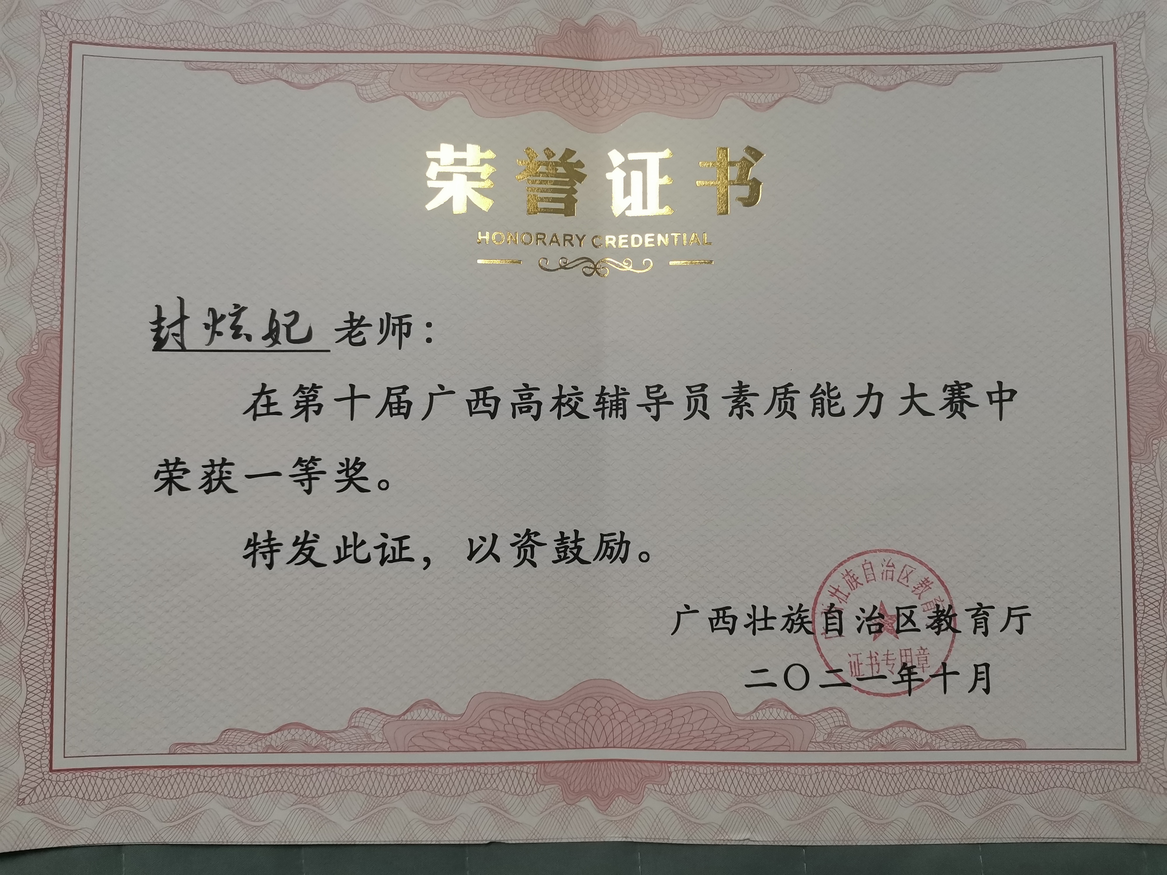 广西建院10月24日讯(管理工程学院 郭海棠)10月20日至22日,第十届广西高校辅导员素质能力大赛在广西师范大学顺利落下帷幕,完美(中国)官方管理工程学院辅导员封炫妃、建筑与规划学院辅导员冯光帆双双荣获大赛一等奖,其中封炫...