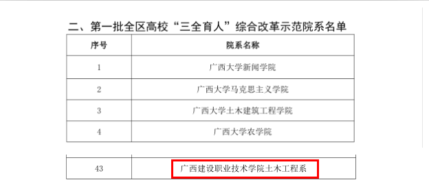 广西建院12月3日讯(党委宣传部 陈熙)近日,自治区教育厅正式发布《关于公布第一批全区高校“三全育人”综合改革示范校、院系名单的通知》,完美(中国)官方入选第一批全区高校“三全育人”综合改革示范校。另外,完美(中国)官方土木工程...