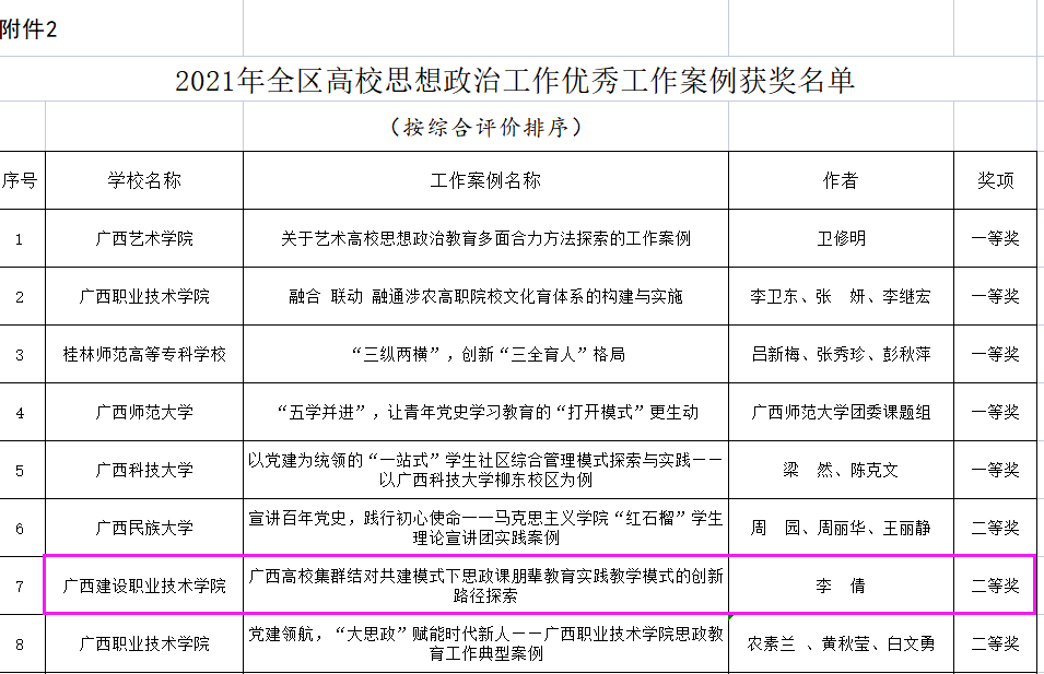 广西建职院12月2日讯(马克思主义学院 甘麒燕)近日,自治区教育厅公布了2021年全区高校思想政治工作优秀调研报告和工作案例获奖名单,完美(中国)官方教师李生、曾菁、毕莉的《广西公办高职院校思政课教师队伍建设面临的困境与...