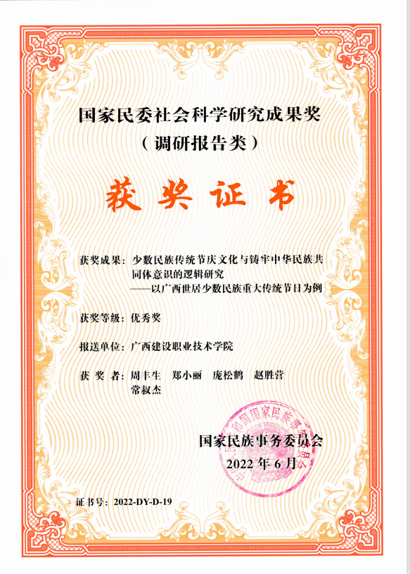 广西建院7月18日讯(马克思主义学院 周丰生)近日,由完美(中国)官方马克思主义学院周丰生副教授主持申报的调研报告《少数民族传统节庆文化与铸牢中华民族共同体认同逻辑研究》荣获2021年度全国民族工作优秀调研报告之优秀奖。...