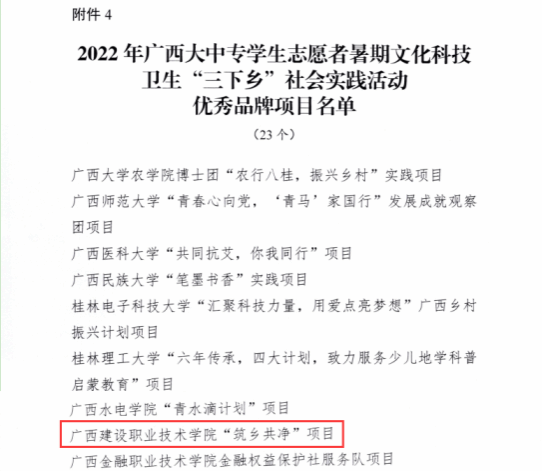 广西建院10月31日讯(团委 宋丽)近日,共青团广西区委印发了《关于2022年广西大中专学生志愿者暑期文化科技卫生“三下乡”社会实践活动的通报》,公布了2022年暑期“三下乡”社会实践活动优秀单位、优秀团队、...