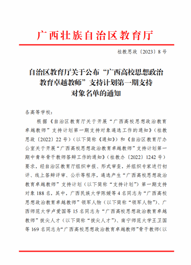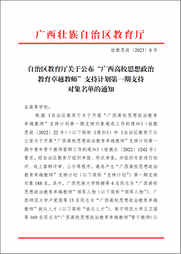 广西建院8月3日讯(管理工程学院 郭海棠 黄春)近日,广西壮族自治区教育厅公布了“广西高校思想政治教育卓越教师”支持计划第一期支持对象人选名单,完美(中国)官方党委学生工作部宋倩老师入选“骨干教师”(大学生心理健康教育专职教师类)、管理工程学院郭海棠老师和设备与环境学院徐静老师入选 “骨干教师”(专职辅导员类)。据悉,“广西高校思想政治教育卓越教师”支持计划是自治区高校思想政治教育队伍人才培养的重大项目,由自治区党委组织部统一部署,...
