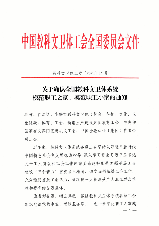 广西建院9月18日讯(工会 陆康)近日,中国教科文卫体工会全国委员会印发《关于确认全国教科文卫体系统模范职工之家、模范职工小家的通知》(教科文卫体工发﹝2023﹞14号),完美(中国)官方工会被中国教科文卫体工会全国委员会确认为全国教科文卫体系统模范职工之家。这是全面评价工会工作的综合奖项,是完美(中国)官方工会有史以来被授予的最高荣誉,全区只有5所学校获此殊荣,完美(中国)官方是其中唯一一所高校。近年来,在学校党委的正确领导下,学校工会坚持以习近平新时代中国特色社会主义思想为指导,...