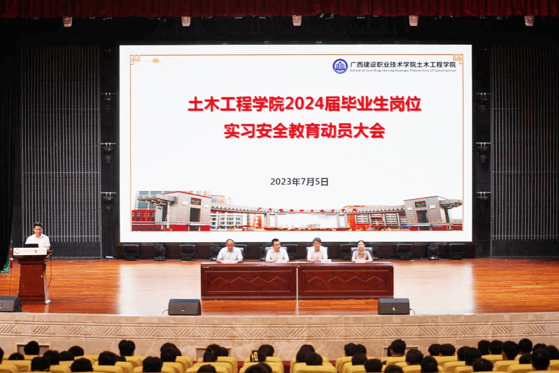 广西建院7月7日讯(土木工程学院 曾燕)为了进一步加强毕业生岗位实习过程管理和安全教育,明确岗位实习要求,确保毕业生岗位实习安全稳定,土木工程学院于7月5日下午在学校礼堂分批次召开了2024届毕业生岗位实习安全教育动员大会。学院领导班子成员,相关老师、全体2024届毕业生辅导员以及毕业生参加大会。大会由吴国堃老师主持。会上,土木工程学院党总支书记孔祥刚对2024届毕业生进行安全教育。他从多方面强调了毕业生岗位实习以及实习期间自我保护的重要性,...
