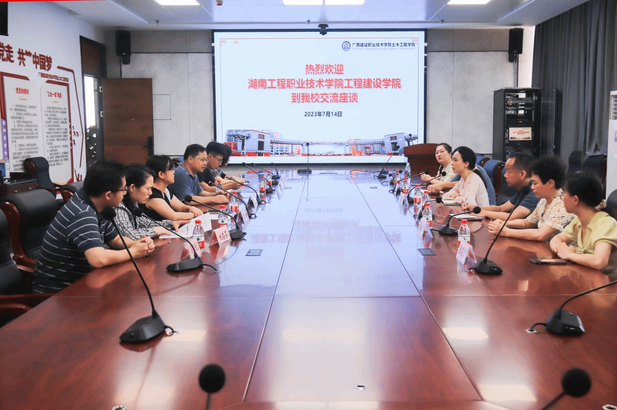 广西建院7月15日讯(土木工程学院 冯耀纪 李盛福)7月14日,湖南工程职业技术学院建筑工程技术专业教研室主任田欣妮一行7人到学校土木工程学院座谈交流。土木工程学院办公室主任唐未平、装配式建筑工程技术专业教学团队带头人刘学军教授、市政与交通学院姚杏芬教授、智能建造技术专业教学团队带头人黄平等老师在5教10楼会议室热情接待了来宾。座谈会上,唐未平主任对田欣妮主任一行表示热烈欢迎。刘学军教授和姚杏芬教授分别代表土木工程学院和市政与交通学院简要介绍了两个二级学院在党建工作、...