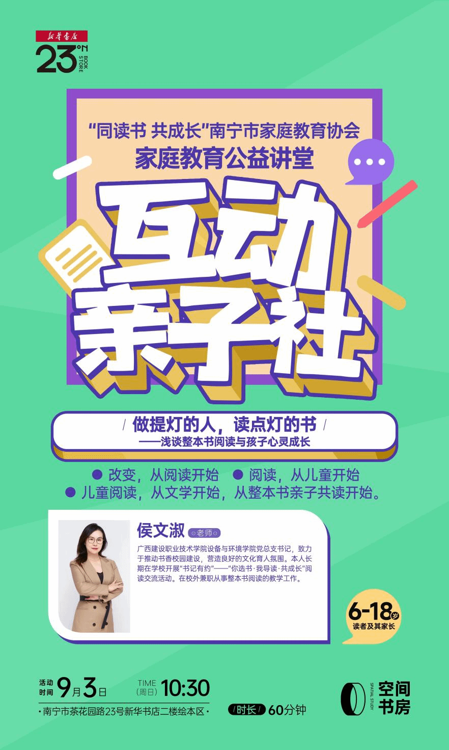 广西建院9月4日讯(设备与环境学院 文/侯文淑 图/韦思源)为推动书香家庭建设,让更多的孩子爱上阅读,设备与环境学院党总支书记侯文淑应邀参加南宁市家庭教育协会举办的八桂家教直通车“千名万场”服务活动,于9月3日在茶花园路23号新华书店开展题为《做提灯的人 读点灯的书——浅谈整本书阅读与孩子心灵成长》的专题讲座。侯文淑老师带领听众赏析一首小诗《提灯的人》,引出书是灯,阅读照亮前行的路;书是桥,阅读连接知识的彼岸。...