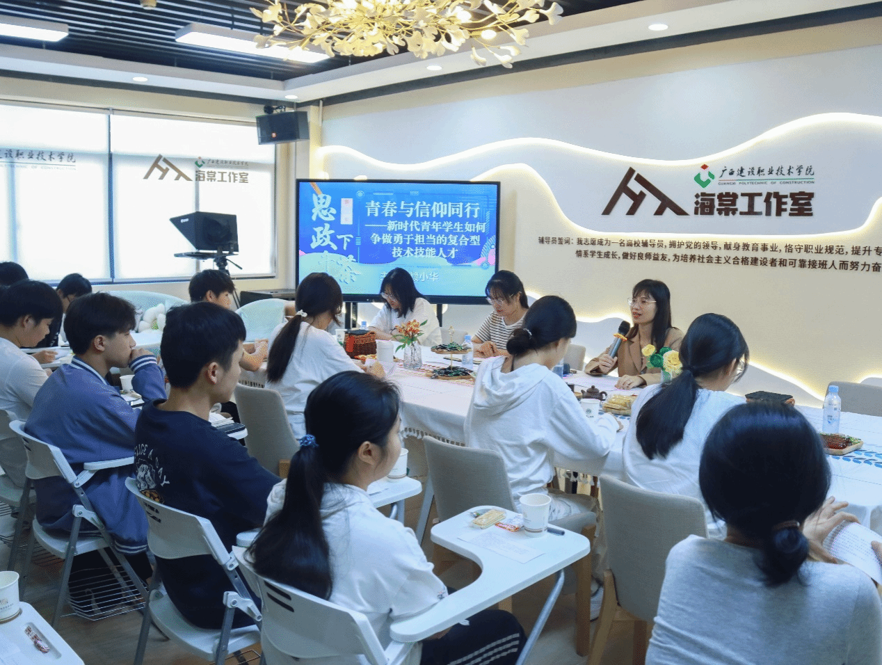 广西建院10月18日讯(管理工程学院 文/莫文娟 黄春 图/黄春)为引导学生树立远大理想,做奋勇有担当的有志青年,10月17日下午,管理工程学院在海棠工作室开展第20期“思政下午茶”活动。本期下午茶论题为《青春与信仰同行,新时代青年如何争做勇于担当的复合型技术技能人才》,由学院党务干事、专职组织员赖小华老师主讲,辅导员韦彩霞、班主任王慧淼到场与25位同学面对面讨论。赖小华老师表示,职业教育肩负着培养多样化的人才传承技术技能,...