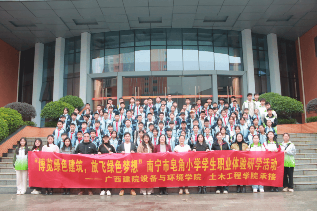 广西建院3月14日讯(设备与环境学院 文/段春毅 图/莫伟健 唐妹芬)3月14日,学校设备与环境学院、土木工程学院携手,为南宁市皂角小学六年级的100名小学生带来了一场别开生面的职业体验研学活动。本次活动的主题是“博览绿色建筑,放飞绿色梦想”,旨在通过实地参观和亲身体验趣味小实验,激发孩子们对绿色建筑的兴趣,培养他们的环保意识,同时为他们未来的职业发展播下种子。活动伊始,土木工程学院的教师们在建筑安全体验馆,通过AR、...