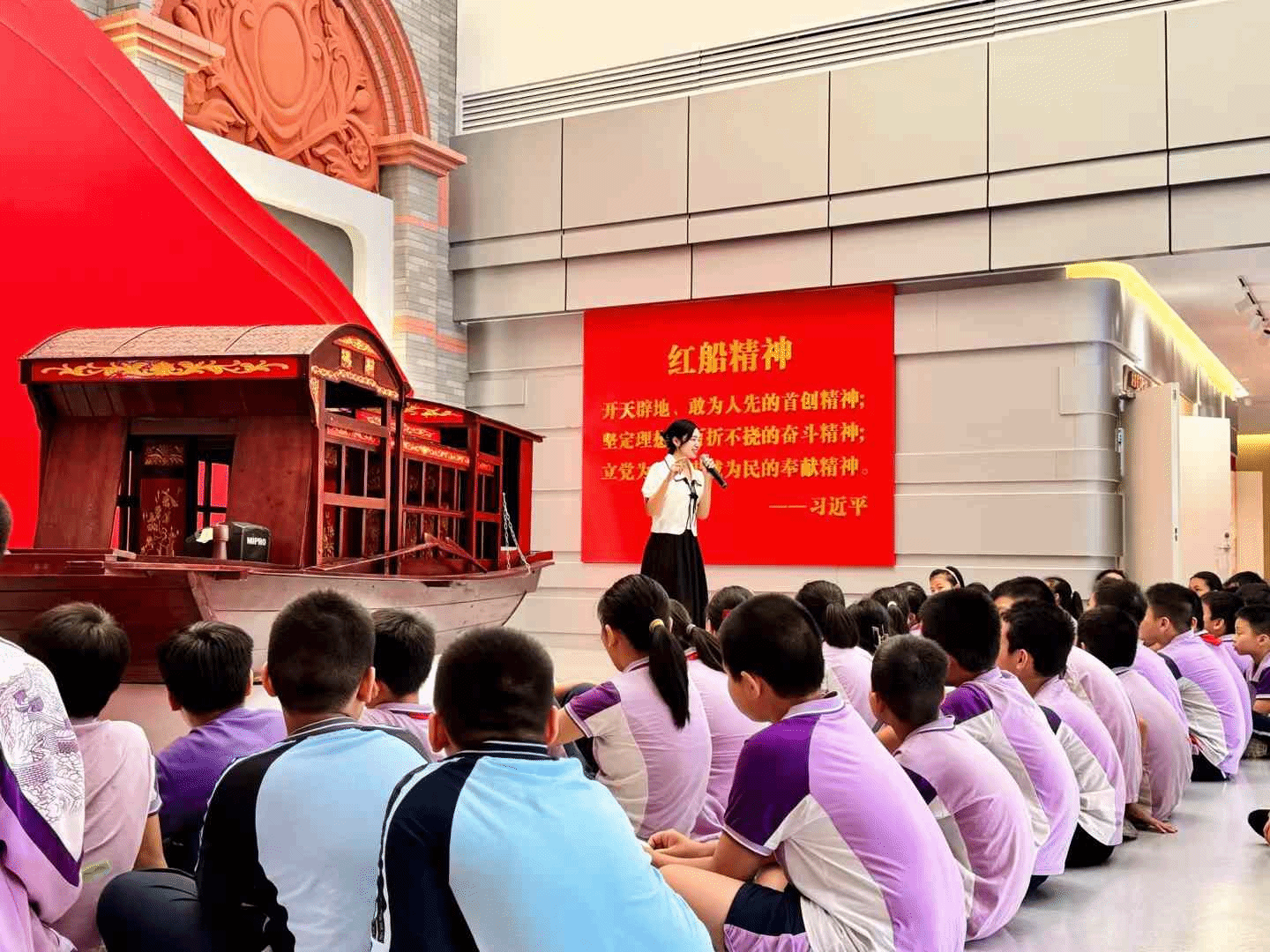 广西建院11月21日讯(马克思主义学院 文/范峥 图/毕莉)近日,马克思主义学院携手南宁市西庄路小学在学校党建思政教育基地开展了以“共筑红色育人同心圆,构建大中小学思政课一体化建设新格局”为主题的红色研学活动,部分思政课教师、400余名五六年级学生共同见证了这场精彩纷呈的思想盛宴。“红船是我们党的母亲船,之所以这么说,是因为在这艘红船上,诞生了我们伟大的中国共产党,有了中国共产党,从此中国革命的面貌就焕然一新了”...