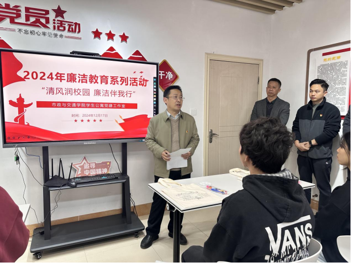 广西建院1月3日讯(市政与交通学院 刘晗蕾)为弘扬传承廉洁文化,把廉洁文化建设融入育人全过程,引导广大师生夯实清正廉洁思想根基,培养廉洁自律道德操守,市政与交通学院近期开展了“清风润校园 廉洁伴我行”主题系列活动,以丰富多样的形式将廉洁理念深植师生心中。学校纪委办(监察室)主任吴锋出席活动并讲话,他以生动的案例和深入浅出的讲解,向同学们阐述了清正廉洁的重要性和必要性。 学校纪委办(监察室)主任吴锋讲话在廉洁主题艺术课程中,...